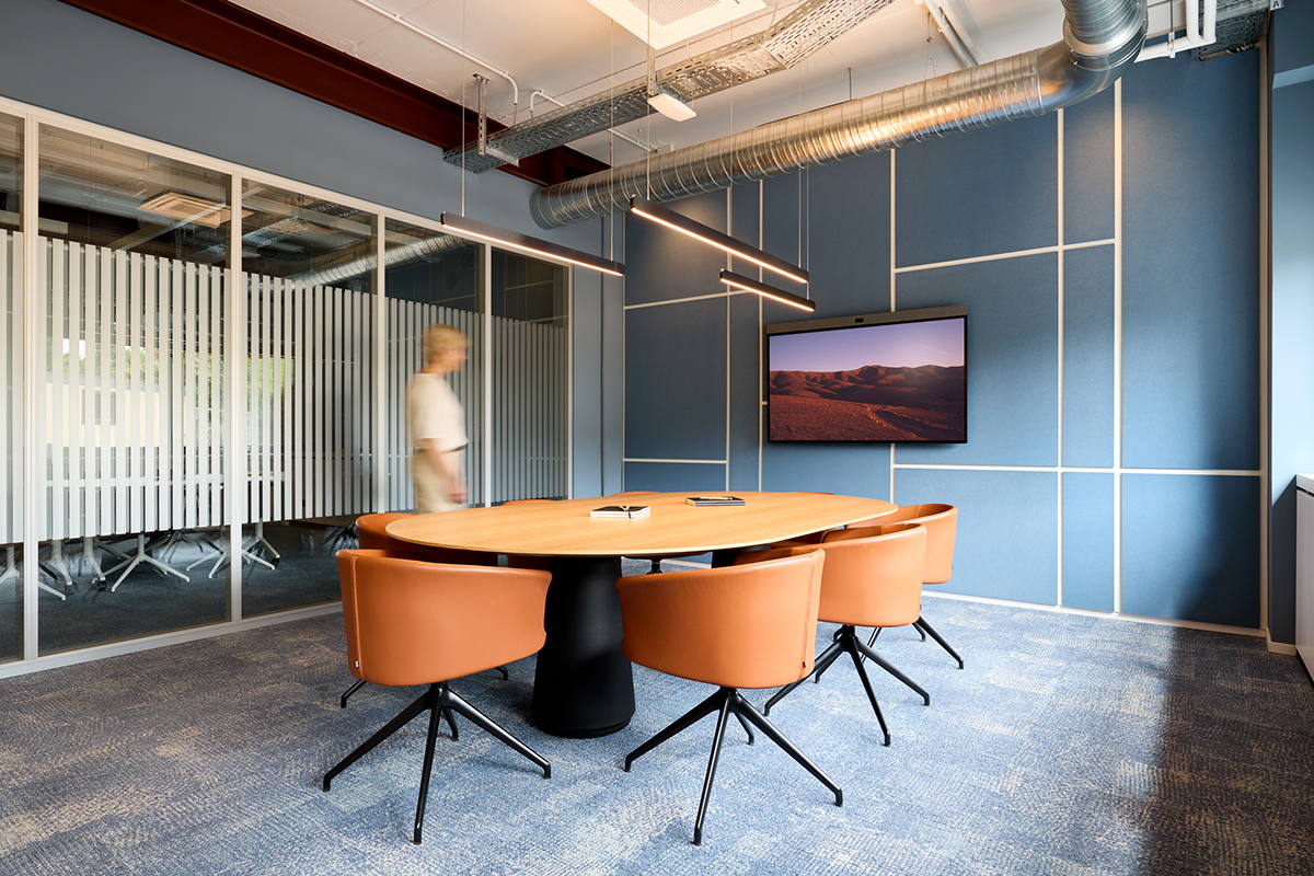 Im Mittelpunkt des Konzepts stehen Austausch und Teilhabe: Unterschiedlich zonierte Bereiche schaffen Räume für konzentriertes Lernen, lebendige Diskussionen und große Events mit bis zu 50 Teilnehmenden. Transparente Glasfaltwände erlauben es, Flächen flexibel zu öffnen oder zu schließen, sodass je nach Bedarf intime Workshop-Situationen oder großzügige Begegnungsorte entstehen. Die Gestaltung setzt dabei auf warme, natürliche Materialien. Helle Linoleum- und Teppichbeläge, akustische Deckenelemente und ausgewählte Möbel optimieren Klang und die Raumwirkung, während eine sorgfältig abgestimmte Farb- und Lichtpalette eine Atmosphäre erzeugt, die Professionalität und Wohlgefühl miteinander verbindet.